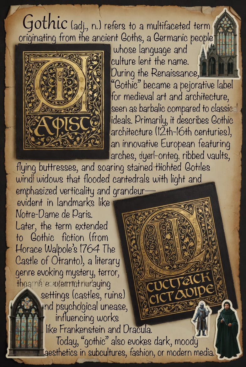 Later, the term extended to Gothic fiction (from Horace Walpole’s 1764 The Castle of Otranto), a literary genre evoking mystery, terror, the supernatural, decaying settings (castles, ruins), and psychological unease, influencing works like Frankenstein and Dracula.