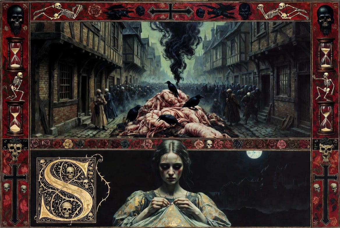 London lay in ruins, streets choked with bloated corpses, air thick with rot’s sweet-sick perfume. Widowed, orphaned, she stitched shrouds for the damned until fate’s thread pulled her to the Fine Lady’s manor.